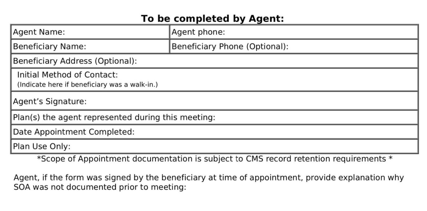 The Centers for Medicare and Medicaid Services requires agents to document the scope of a marketing appointment prior to any individual sales meeting to ensure understanding of what will be discussed between the agent and the Medicare beneficiary (or their authorized representative). All information provided on this form is confidential and should be completed by each person with Medicare or his/her authorized representative.